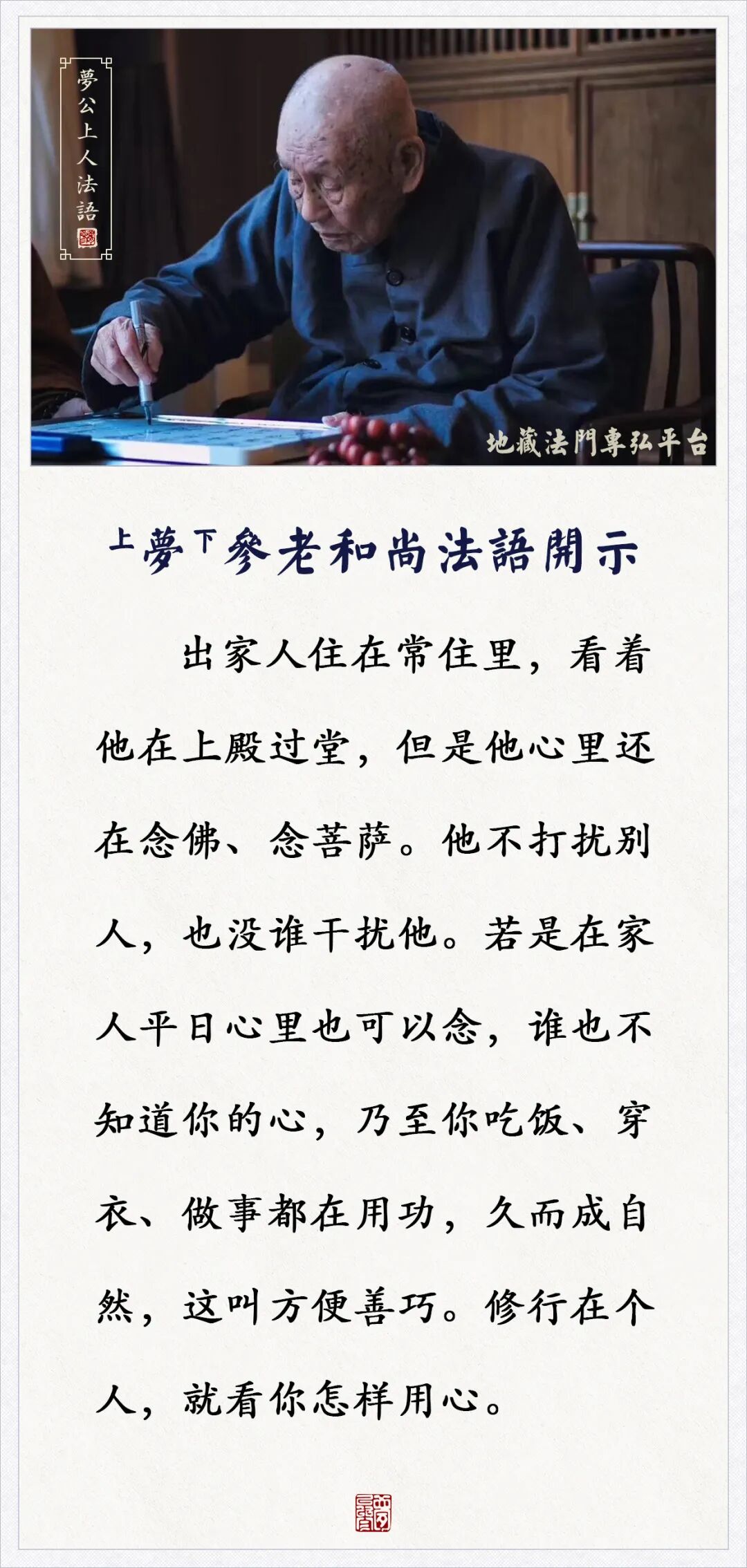 在家人平日心里也可以念,乃至吃饭、穿衣、做事都在用功(梦参老和尚)