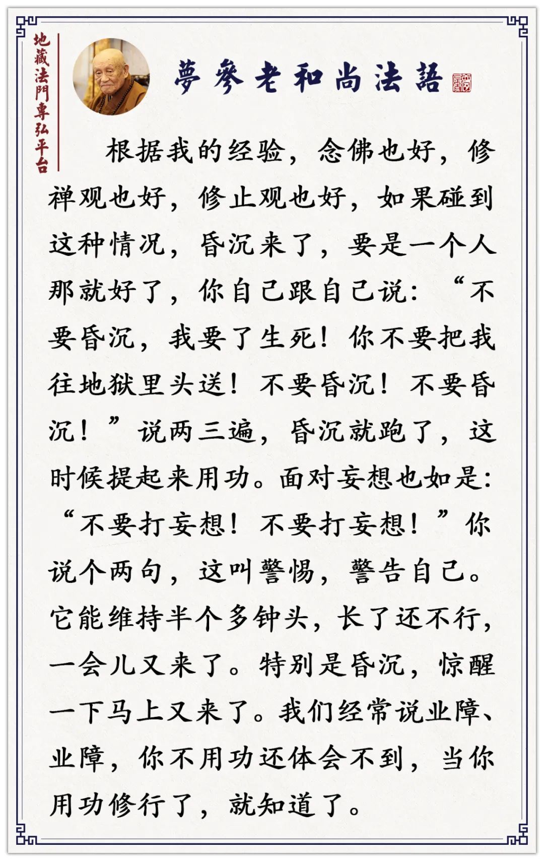 还有昏沉,你自己也想对治的办法。好比这念经,念经一边昏沉了,你大声喊几声,这是自己跟自己。大众在一块堆儿可不行,你打别人闲岔。你自己念经时候,叫你自己的名字——“梦参,你不要打瞌睡,打瞌睡要下地狱的!”还要生起恐怖想。你说个三两遍,那个瞌睡就没有了,就让你把它撵跑了。你自己得想很多的方法。修行,除了佛教导我们的方法之外,你自己也得生善巧方法。