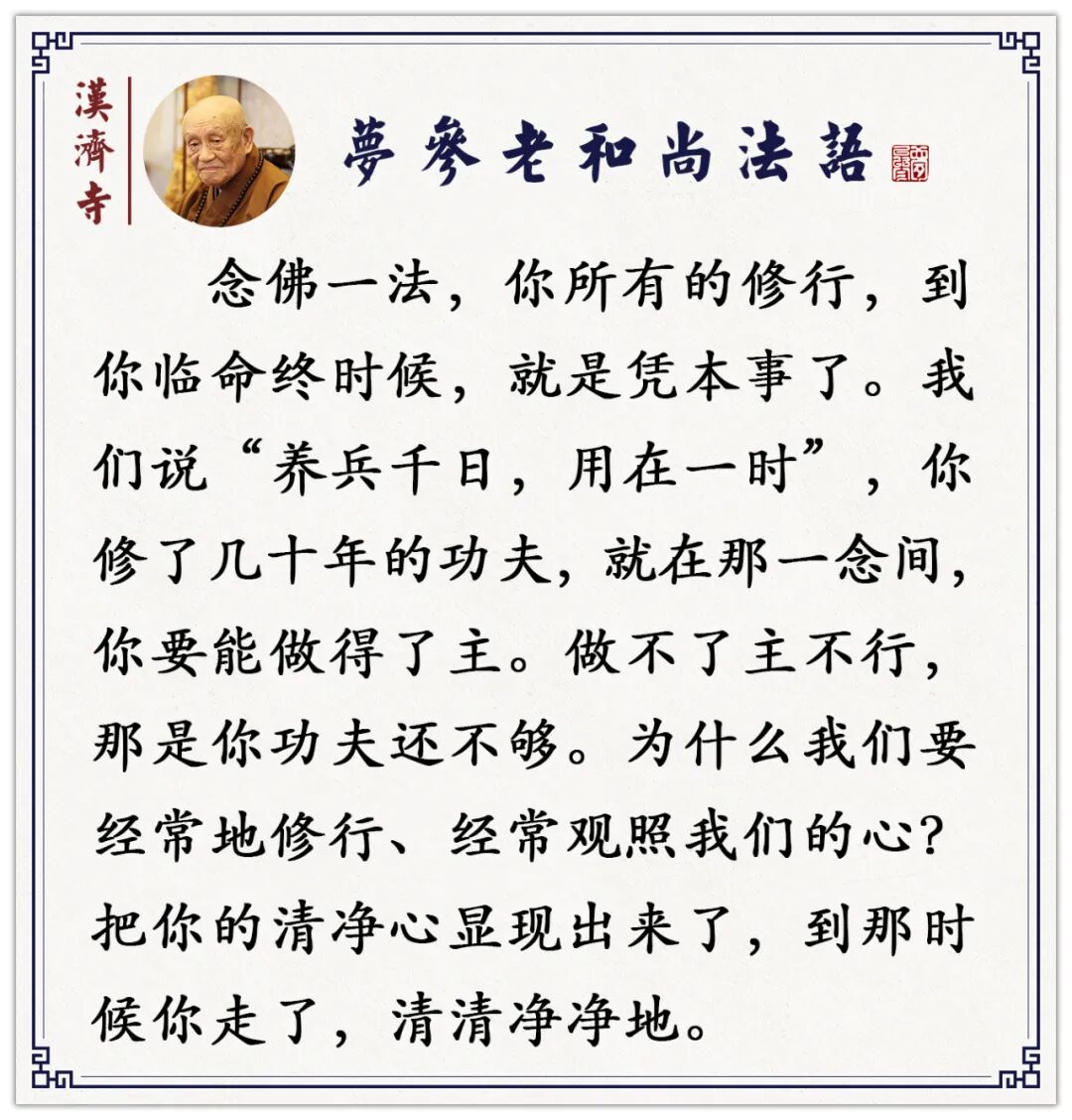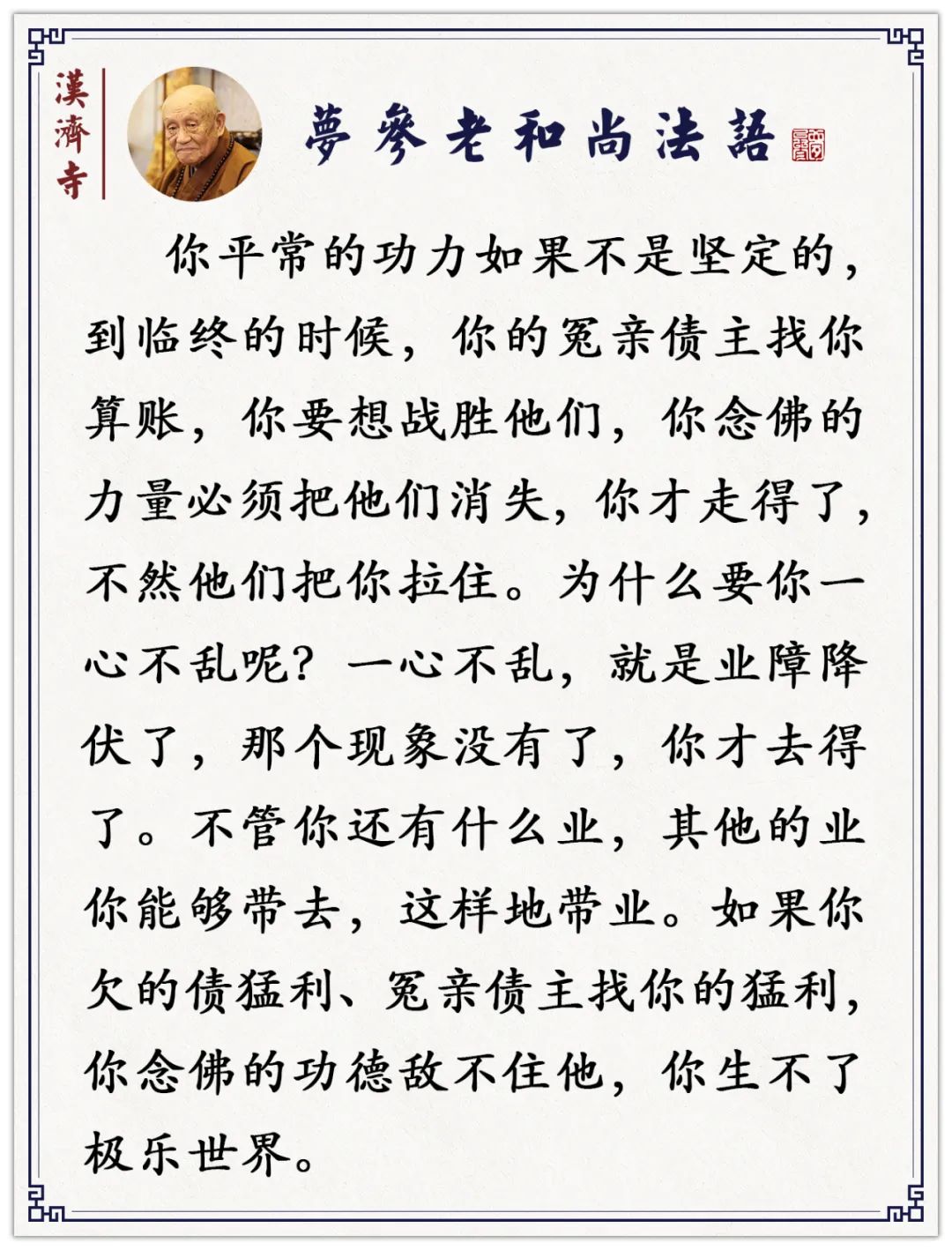 特别要注意临命终的时候,那个时候的愿非常重要;那个时候的思想非常重要;那个时候是不是还能念佛、念法、念僧,那是非常地重要!那叫最后关头,也是我们一生总结时候,算个帐吧。在算总帐的时候,业多了,障到你净行起不来了,念佛没有了。咱们不说咱们我执很重、空见还没有的,就像目犍连尊者那样的,到了外道打他的时候、他要舍身命,没舍身命之前、打他那时候,神通都现不起来了。如果是他舍身命时候,他已经成道了,他也能够忍受。如果我们临终时遇到那个环境,对打你的人,你起嗔恨心不起嗔恨心?你能够认为他是帮助你成就道业的吗?你在临命终时受到迫害,如果你心里想:“他是帮助我消灭罪业,我过去宿业都消了,我这回就能得到往生了。”那时候你要能念佛号的话,一定能生到极乐世界去。恐怕就是到那个时候力量没有了。我们在一切要犯罪的时候、或者要犯戒的时候,你那个时候三宝的意念还现前不?如果现前的话,你那罪不会犯的、业不会造的,那说明你过去的业能消。常修梵行,为了临终一念;常念阿弥陀佛,为了最后一遭。这个一定要注意,那个时候就是检验功夫的时候。到你危难、痛苦的时候,我的心里想:如果我们佛教徒真是佛弟子,如果医生说你是癌症了、宣布你死刑了,你听到这个,你可以拼命地修了,这是你的好机会。这个病在佛教徒身上不是很好吗?他可以拼命地修了,到最后的关头他就走了,清净地走了。如果你不能做到这样子,到时候抱怨,又想治疗、又想好,愈来愈糟!
