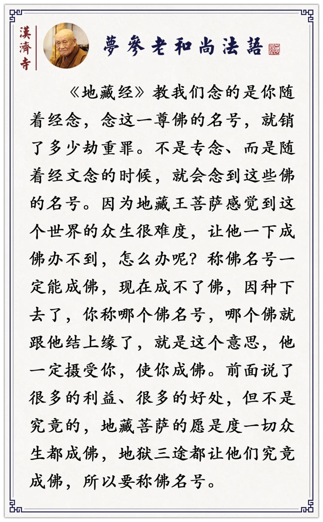 地藏王菩萨就考虑到这种情形,众生在生死轮回当中,不见得像前面所说的,给他临终时念一句圣号、念一句经典就能使他得到利益。怎么办呢?活着念。他说这些佛名号就是当我们身体健康的时候念的,现在我们念地藏经,一天念一遍乃至你只念一个“称佛名号品”也好,就能得到不可思议的好处。佛就赞叹他,说这种的事情很好。