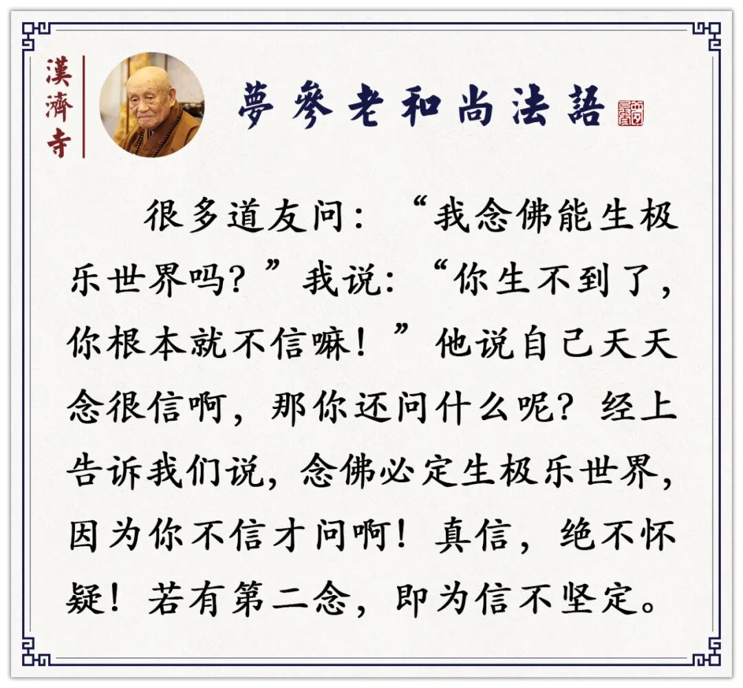 学佛法的第一个要求——不要怀疑,相信佛一定能救度我,这就够了。皈依佛了之后,我依靠佛了;我心依靠佛了,我身体皈依佛门了,我一定得救了。再不怀疑了,再不去找外道去学神通!学佛一、二十年了,还找印度锡克教去学神通——锡克教是有些道术,而且他自己还做了很多的注解,写了很多的书。之后还去学外道,你说这是什么原因产生的?根本没信!他对佛教没信,没信就没入。 有些人信佛没几天,就念佛,念佛就害病,之后他就死了,生极乐世界了。应该确信不疑,临终十念就可以了。《弥陀经》说:“若一日,若二日,若三日,乃至若七日。”他这样一心念佛,一心不乱,就再不想世间事了、再不留恋这个世间,他一定能生。 如果你没有坚定的信心,怀疑,你什么也入不了。如果你创一个事业,乃至于说你想发财,你今天干这行,明天干那行,你挑来挑去,你哪里也发不了财。你得一门深入,久了也就精了,精了你就能有智慧了,有智慧了,对这门你就能入得进去。 你最初的时候,一定要坚定信心,一定要皈依佛、皈依法,之后,别再怀疑,一定坚定去做、去修行,就是念、诵、持。当你念的时候、持的时候,你心里的忆念就缘念,就是绝对的,不缘念你念不出来。一起意,一作意——起意就是你心里一起意,就是皈依佛、皈依法、皈依僧。