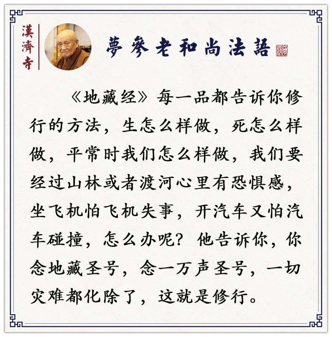 现在学了《地藏经》,修地藏法门。《地藏经》告诉我们,你要到哪里去,觉得有危难,念一万声地藏王菩萨圣号,就可以把苦难免除了。