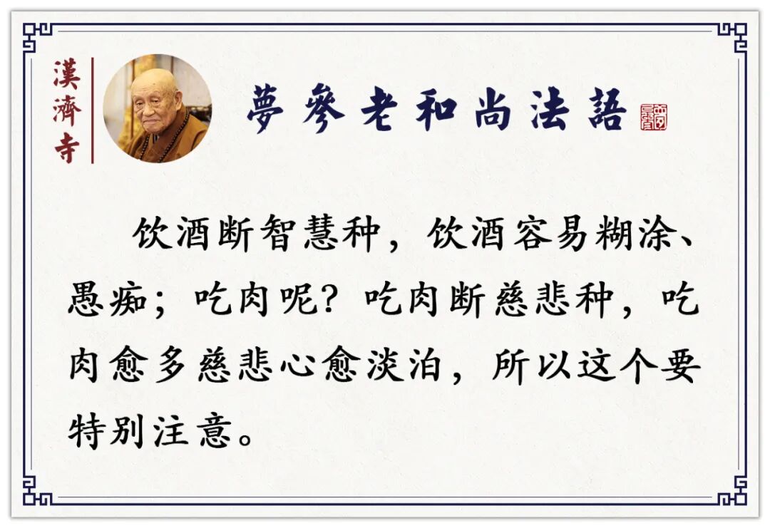 你要想了生死、出三界,你先得吃素。为什么我们佛弟子把吃素看得那么重要?《楞严经》就这样讲,因为它是一切我们犯戒根本,它能助发你犯一切戒。