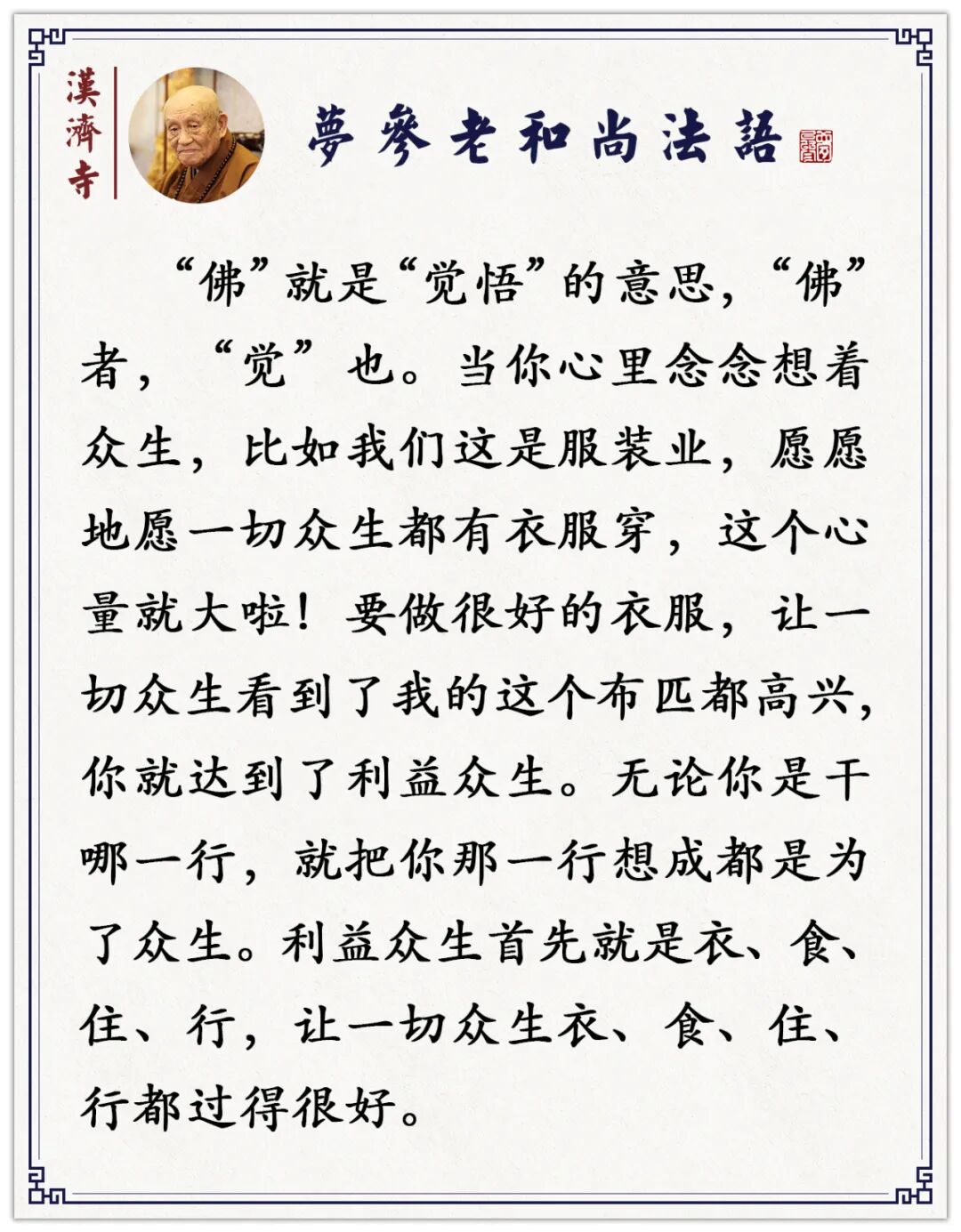 无论我们做做任何事,都要这样发心——不论你织布,还是做衣服,随便你做哪一个工作,你心里想:“我所织出的布匹呀,让人人欢喜,让人人都有衣服穿。”衣服是御寒的、保温的、保护皮肤的,如果你心里常时想到利益别人,让别人穿好,你这一个用心就叫菩萨发心。