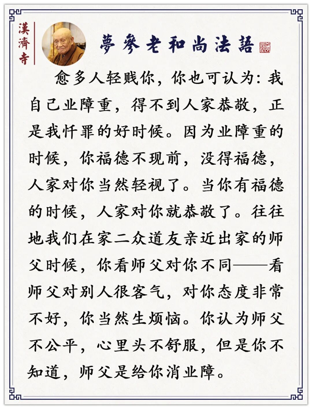 为什么?现在人家轻贱你,你读《金刚经》反遭到轻贱,这一轻贱,外在帮你把业障消灭了,那你证得无上正等正觉证得快一点,转罪业成佛果,转业殊胜。当人家瞧不起你、侮辱你、毁谤你、打你、骂你,乃至一切,你高高兴兴地承纳领受,你说:这下子可好了,我业障就消了!